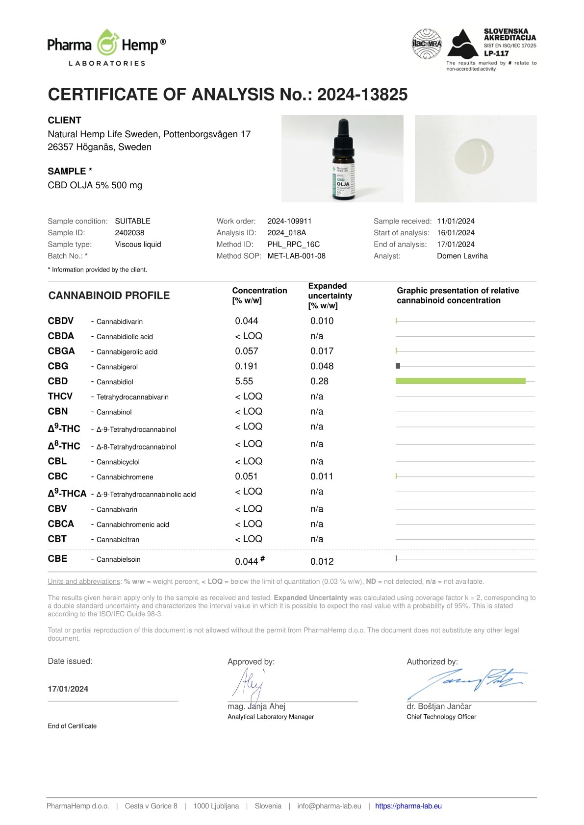 Vår 5% CBD olja innehåller utöver 500mg lättupptaglig CBD ett brett spektrum av cannabinoider och nyttiga fettsyror. För att framställa vår CBD olja använder vi vårt unika CBD extrakt som tar tillvara på hampans breda spektrum av cannabinoider.